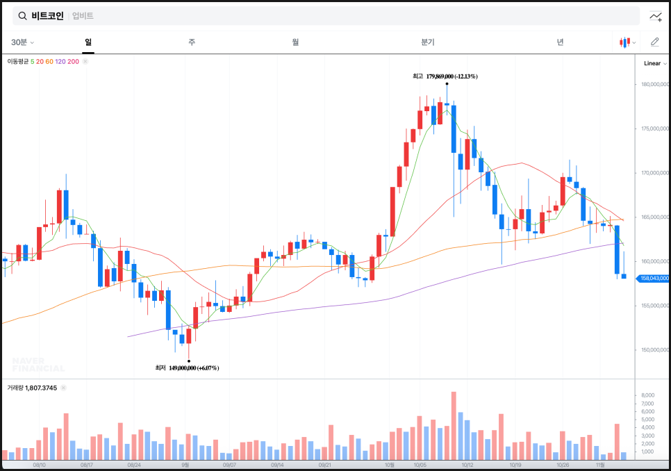 일봉을 보면 최근 비트코인은 10월 중순 최고가 1억 7,986만 원을 찍은 뒤, 빠르게 하락 전환한 모습입니다. 현재는 약 1억 5,800만 원대에서 거래되고 있으며, 5일선(초록색)이 중단기선을 아래로 뚫는 데드크로스 신호가 나타나고 있습니다.