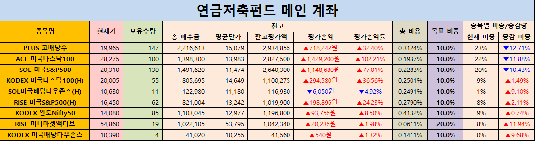 먼저 연금저축펀드 메인 계좌에서는 ‘PLUS 고배당주’를 2주 추가 매수했습니다. 총 보유수량은 147주에서 149주로 증가했으며 평가손익률은 약 +32.4% 수준을 유지했습니다. 이 종목은 꾸준히 배당금을 지급하는 핵심 ETF로 월 단위로 배당 재투자를 이어가고 있습니다. 그 외 ‘SOL 미국S&P500’과 ‘ACE 미국나스닥100’은 10월 매수 내역이 없었고 기존 보유분을 유지했습니다.