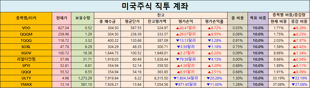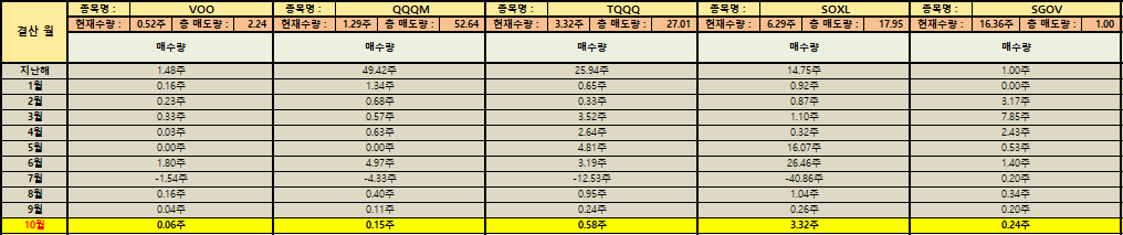 미국 직투 계좌에서는 소폭의 분할 매수가 있었습니다. 이 가운데 ‘SOXL’과 ‘TQQQ’는 기술주 반등을 기대한 제한적 분할 매수이며 각각의 보유수량은 6.29주, 3.32주를 보유중인 반면 ‘VOO’와 ‘QQQM’은 안정적인 지수 추종 ETF로 10월 매수 후 보유량이 소폭 증가했지만 여전히 전체 계좌 내 비중은 낮은 편입니다.