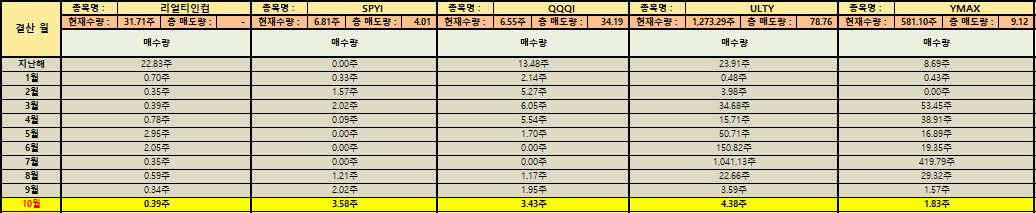 배당형 ETF 중에서는 ‘SPYI’, ‘QQQI’, ‘ULTY’, ‘YMAX’ 등이 꾸준히 매수되었습니다. 특히 ‘ULTY’는 총 보유수량이 1,273주 이상으로 월배당 ETF 중에서도 가장 높은 비중을 차지하고 있습니다. ‘YMAX’ 또한 581주 이상을 보유하며 배당 수익 중심 포트폴리오의 핵심 역할을 하고 있습니다. ‘리얼티인컴’은 31주 이상 보유 중이며 매월 배당을 통해 현금흐름을 만들어가고 있습니다.