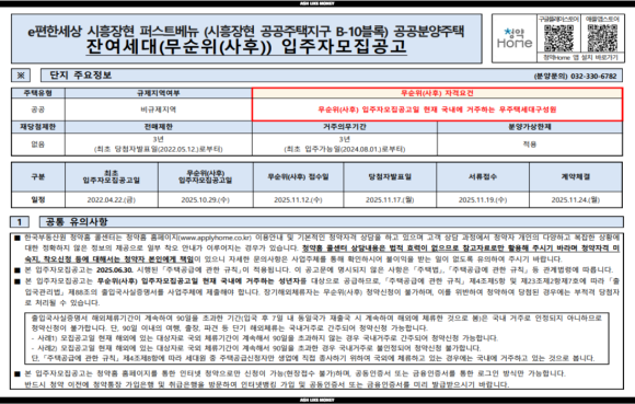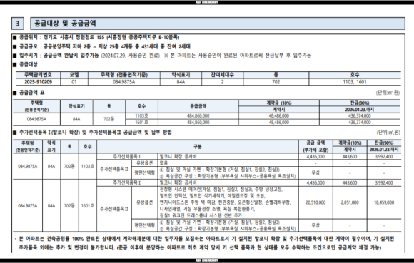 총 431세대 중에서 2세대를 잔여공급한다. 84A타입 2세대로 각각 702동 1103호, 702동 1601호로 분양가가 모두 4.84억이다. 거주의무와 전매제한으로 인해 매물이 없다. 거주의무 3년 조건이 있어 1년 10개월은 계속 입주해야하는 조건이 있다. 계약금은 48,486,000원이고 잔금은 436,374,000원이다.