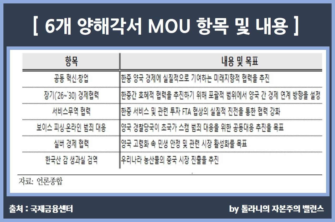 1) 이슈 : 11월 1일 한중정상회담을 통해 양국 정상은 6건의 양해각서(MOU)를 체결하였으며 원-위안 통화스왑 연장에도 합의