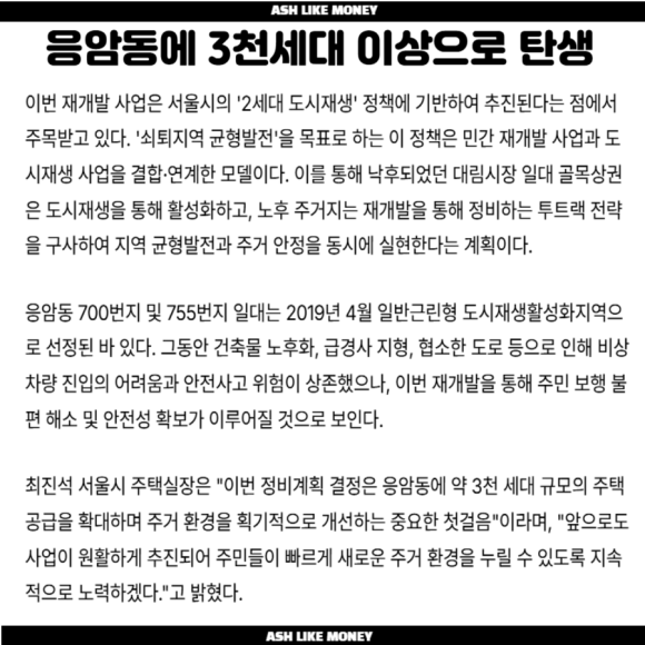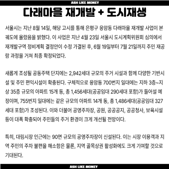 은평구 응암3동은 은평구지만 서대문구 생활권으로 응암3동 다래마을 일대가 노후주택가에서 35층, 2,942의 대단지 세대로 새롭게 탄생하는 시작을 알렸다. 과거 박원순 시장때 그놈의 "도시재생"에만 집중하느라 공급이 매우 박살나 지금의 서울 내 아파트 공급이 매우 적어져 현재 서울 아파트 시세는 고공행진이며 다른 지방과의 격차가 4~10배까지 나기 시작했다. 주식, 코인으로 번 돈은 결국 서울 마포, 성동, 강동, 동작, 강남 3구, 용산의 아파트로 흘러가기 때문이다. 게다가 유동성이 풀리고 금리인하의 기조를 보여 돈의 가치가 하락하는 현재 자산가치의 상승은 "문어게인"이라고 칭할 정도이다.