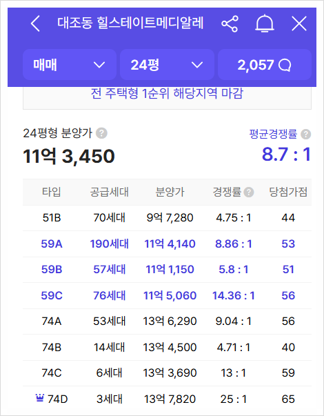 총 수익은 조합원 분양수익 + 일반분양 수익 + 상가수익 + 임대주택 수익으로 정해진다. 총 수익이 높으면 높을수록 비례율이 증가하지만, 높은 분양가만큼 조합원 분담금도 커진다. 이것이 비례율의 함정이다. 조합원 분양가는 대조1구역의 힐스테이트 메디알레가 평당 4천만원 수준이라 조합원 분양가를 평당 3천만원으로 계산해보면 조합원 분양수익은 9,359억이다. 임대주택은 평당 1,500만원으로 계산하면 임대주택 수익은 1,169억이다. 상가는 평당 3천만원으로 계산하면 상가수익은 300억이다.