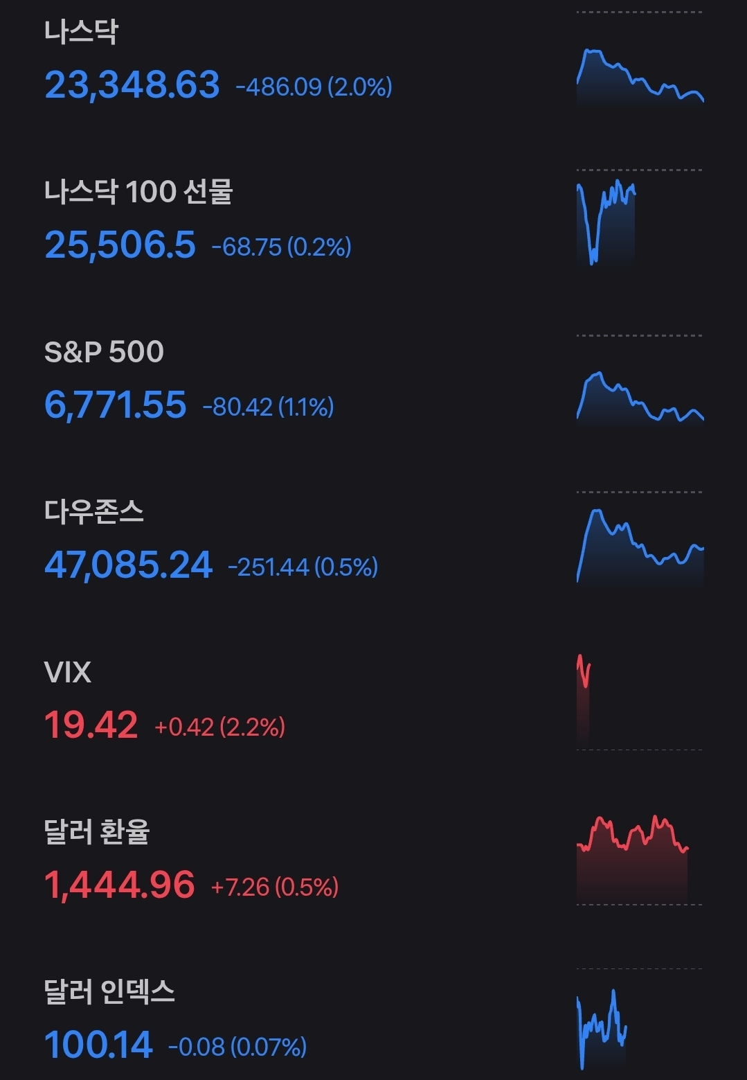 주요 지수는 기술주 중심으로 약세를 보였고 변동성 지표가 상향 안정화되는 흐름입니다. 달러 강세와 정책 불확실성이 겹치면서 멀티플 축소 압력이 우세해졌고요. 금리 기대가 재조정되는 동안 채권 선호가 강화되면서 주식과 통화 시장의 동시 조정이 나타났습니다. 단기 수급은 방어와 현금 선호 쪽으로 기울어진 상태인데요 이벤트에 따라 변동 폭이 커질 수 있는 구간입니다.