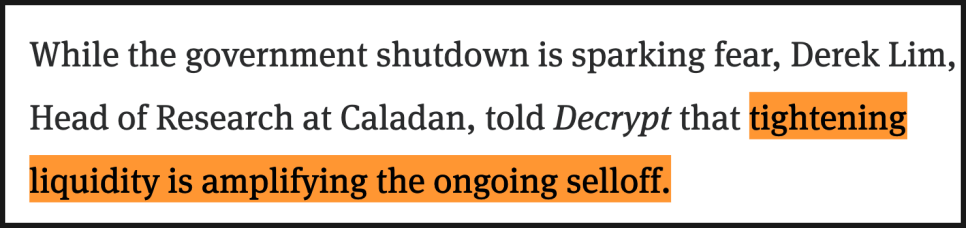 칼라단(Caladan)의 리서치 책임자 데릭 림(Derek Lim)은 “유동성 경색이 셧다운으로 인한 불안감을 더 크게 만들고 있다”고 설명했습니다.