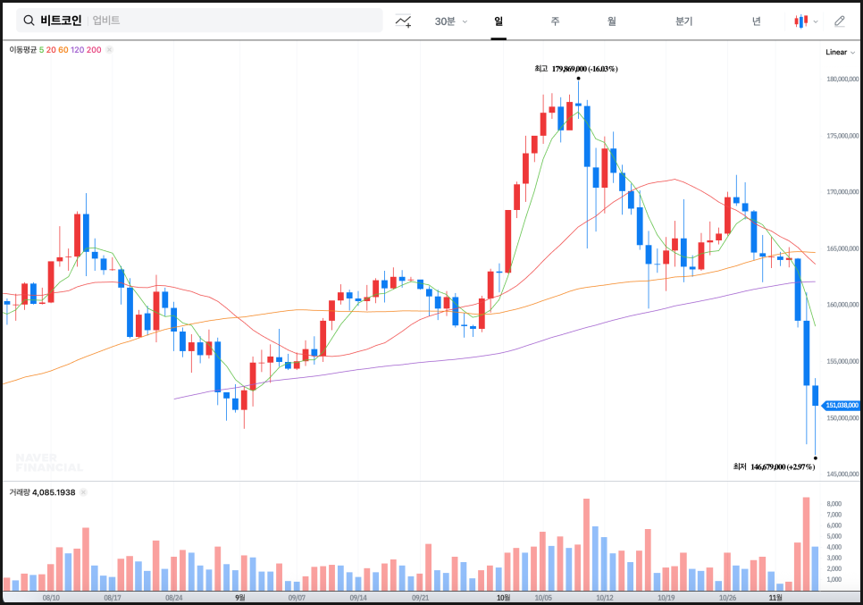 오늘 일봉을 보면 비트코인 현재 가격은 약 1억 5,100만 원대에 머물러 있으며, 최근 며칠간의 하락세가 매우 가파른 편입니다.