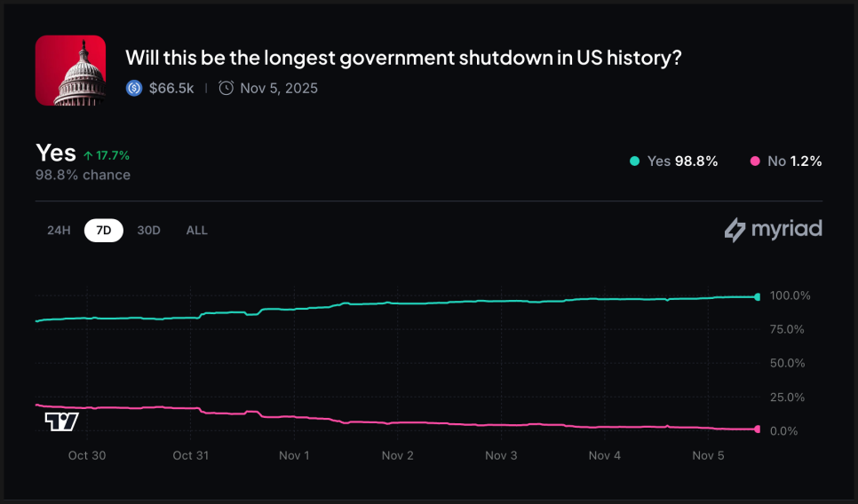 여기에 미국 정부의 셧다운(예산 미통과로 인한 행정 중단)까지 겹쳤습니다. 현재로서는 12월까지 이어질 가능성이 높으며, 예측시장 마이리어드(Myriad)에서는 이번 셧다운이 “미 역사상 가장 긴 셧다운이 될 확률이 98.7%”로 집계되고 있습니다.
