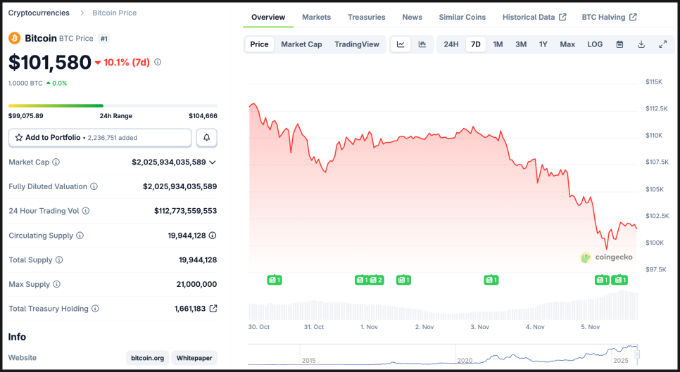 이번 주 글로벌 금융시장은 뚜렷한 변동 국면에 들어섰습니다. 투자자들이 위험 자산에 대한 선호를 줄이면서 암호화폐, 기술주, 금까지 전반적인 조정세가 이어지고 있죠. 세계 최대 암호화폐인 비트코인은 10월 고점에서 약 21% 하락해 한때 10만 달러 아래로 내려갔고, 현재는 910만 1천 달러 부근에서 움직이고 있습니다.