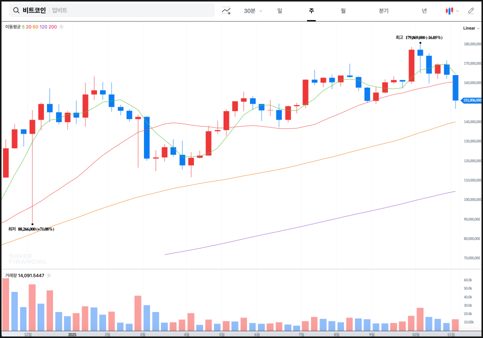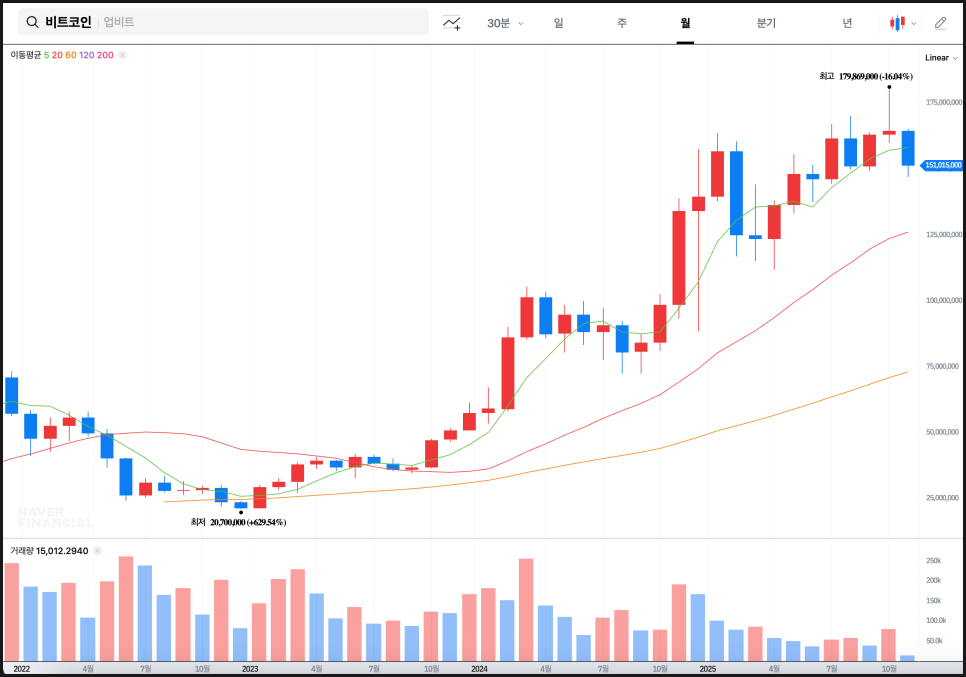 월봉 관점에서 보면, 비트코인은 여전히 장기 상승 추세 속에 위치하고 있습니다. 2022년 약세장 당시 최저가 2,070만 원대에서 시작된 반등이 2년 가까이 이어지며, 현재는 1억 5천만 원에서 1억 7천만 원 사이의 박스권을 형성하고 있죠.