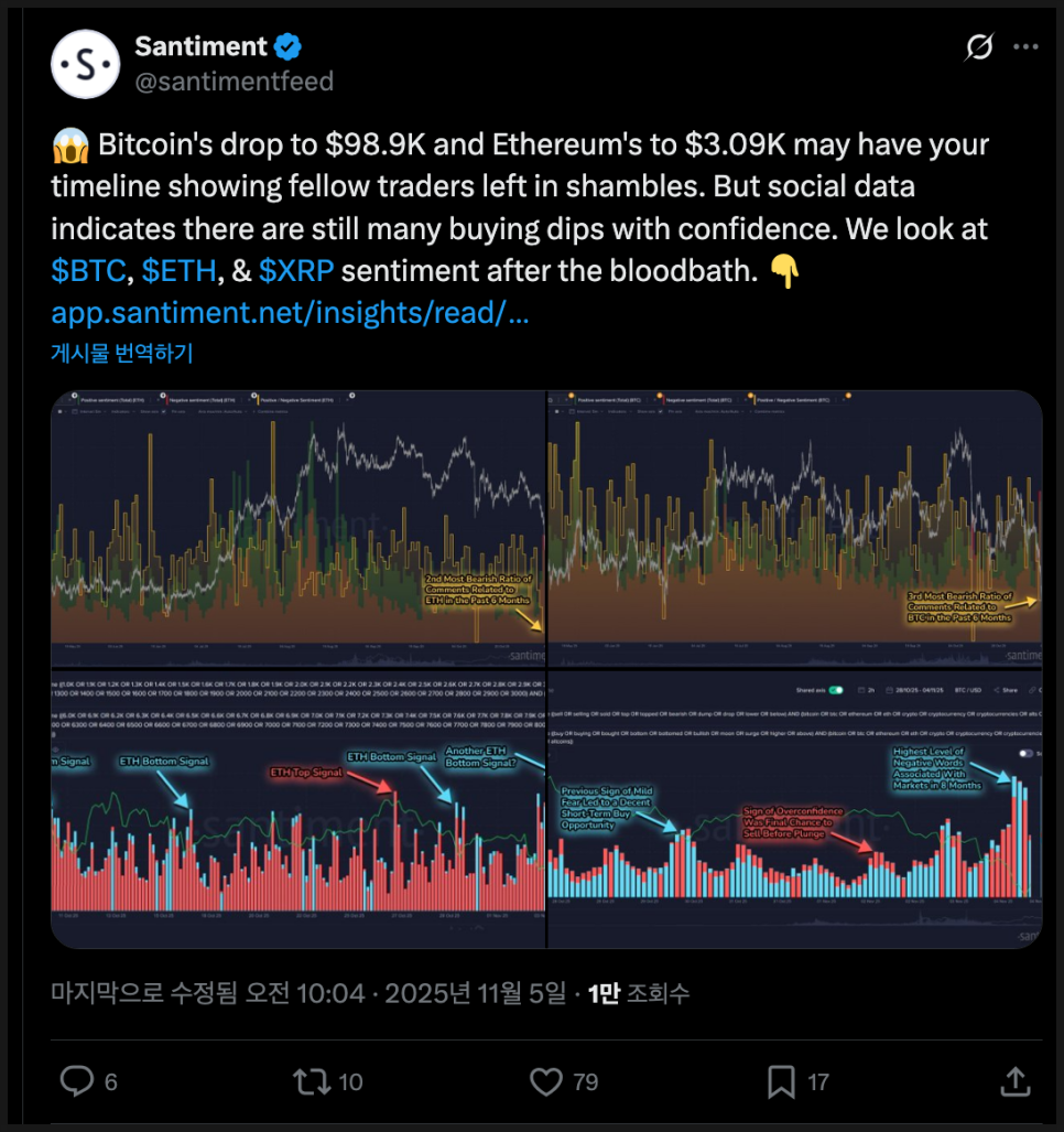 온체인 분석업체 산티멘트(Santiment)도 “사회적 데이터상 여전히 많은 투자자들이 ‘저가 매수’를 시도하고 있다”고 전했습니다.