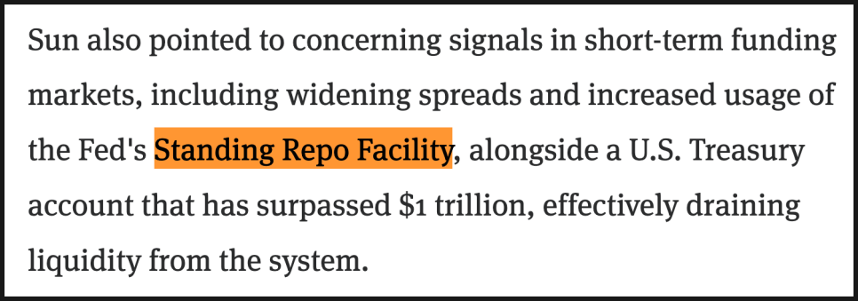 하지만 단순히 환율만의 문제가 아닙니다. 최근 연준(Fed)의 단기 대출 제도인 ‘상설 레포 기구(Standing Repo Facility)’ 이용이 급증하고 있다고 합니다. 이 제도는 금융기관이 보유한 우량 자산을 담보로 현금을 빌릴 수 있도록 하는 시스템인데요, 이용이 늘어난다는 것은 ‘시중에 돈이 부족하다’, 즉 유동성이 빠듯하다는 신호로 해석됩니다.