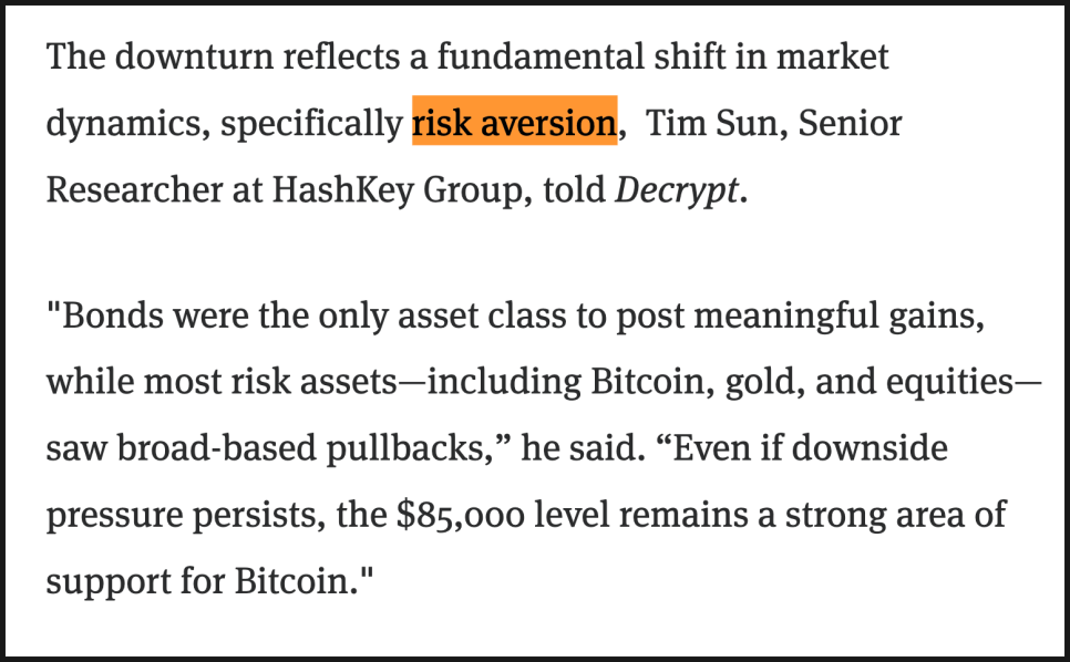 한편, 해시키그룹(HashKey Group)의 팀 선(Tim Sun) 연구원은 “이번 조정은 시장의 근본적인 심리 변화, 즉 ‘위험 회피(risk aversion)’가 본격화된 신호”라고 말했습니다. 쉽게 말해, 투자자들이 주식이나 암호화폐 같은 고위험 자산에서 돈을 빼서 안전자산인 채권이나 현금으로 옮기고 있다는 뜻입니다. 그는 “현재 채권만이 의미 있는 상승세를 보이고 있고, 비트코인, 금, 주식 등 대부분의 위험자산이 동반 하락 중”이라고 덧붙였습니다.
