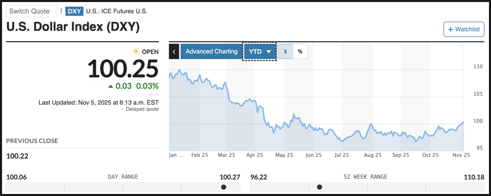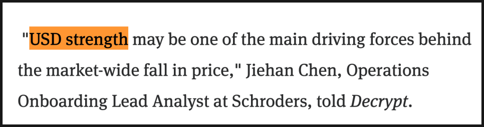 이번 조정의 또 다른 배경에는 ‘달러 강세’가 있습니다. 달러 가치가 오르면, 달러로 거래되는 자산(비트코인 포함)이 해외 투자자 입장에서는 더 비싸게 느껴지게 되죠. 이 때문에 달러 강세는 비트코인 가격 하락을 압박하는 주요 요인이 됩니다. 슈로더(Schroders)의 애널리스트 지에한 천(Jiehan Chen)은 “달러 강세가 이번 시장 전반의 가격 하락을 주도한 핵심 요인 중 하나일 것”이라고 말했습니다.