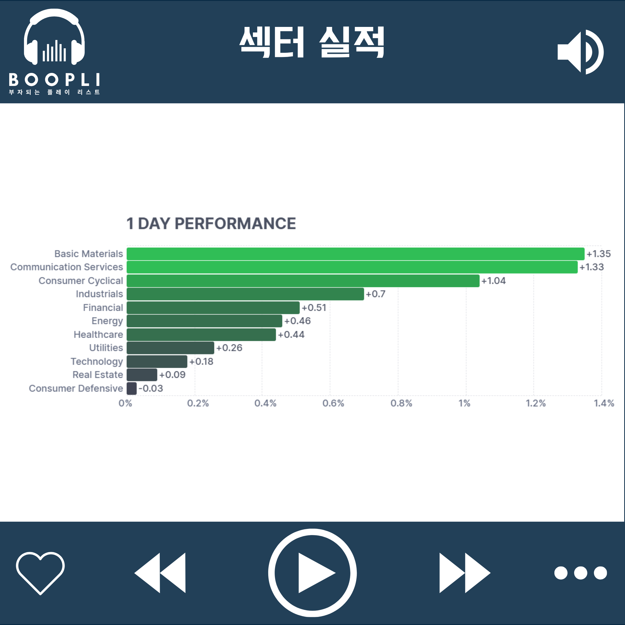 원자재 섹터가 상승을 주도, 이어서 커뮤니케이션 서비스, 소비 순환재, 산업재, 금융 순으로 강세