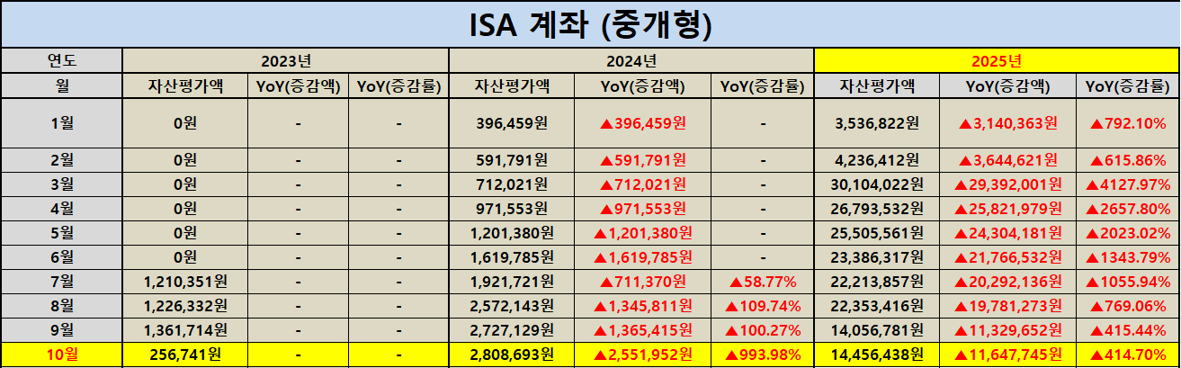 ISA 계좌는 이번 달에도 잔잔한 상승 흐름을 이어갔습니다. 절세 계좌의 가장 큰 장점은 단기 변동에 크게 흔들리지 않는 안정성이죠. 꾸준히 적립해 온 ETF들이 금리와 환율 변화 속에서도 안정적으로 자리를 잡아주며 전체 포트폴리오의 균형을 맞춰주었습니다.