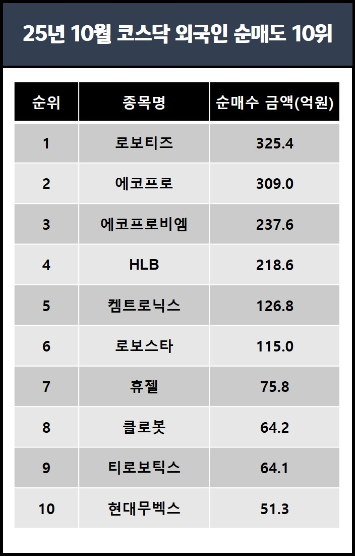 ● 25년 10월 한 달동안 코스닥 시장에서 외국인 투자들은 2차전지 관련주, 반도체 장비 관련주, 바이오 관련주들 성장 산업에 집중 매수세를 보였으며, 일부 로봇 및 바이오, 2차전지 일부 종목의 차익실현 매도세를 보였습니다.