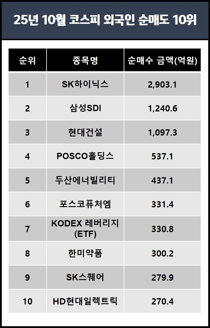 ● (순매도) 10월 한 달동안 코스피 시장에서 외국인 투자자들이 순매도한 종목 및 순매도 금액 10위를 알아보면 1위 SK하이닉스, 2위 삼성SDI, 3위 현대건설로 집계 되었습니다.