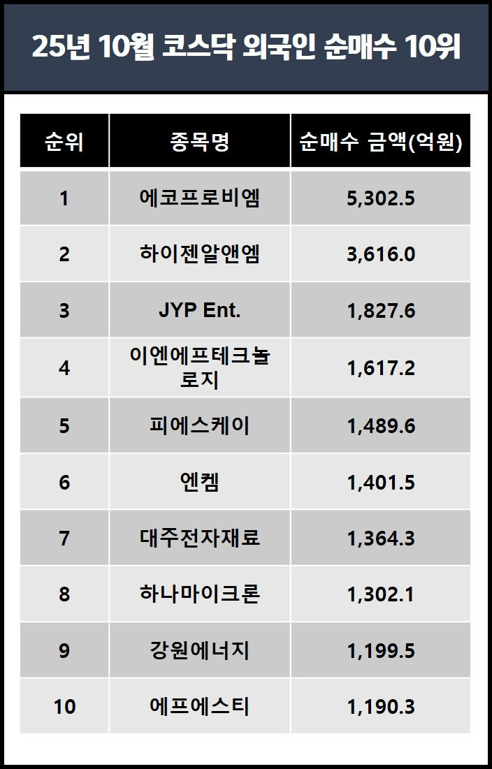 ● (순매수) 10월 한 달동안 코스닥 시장에서 외국인 투자자들이 순매수 종목 및 순매수 규모 10위를 살펴보면 1위 에코프로비엠(2차전지 관련주), 2위 하이젠알앤엠(로봇 관련주), 3위 JYP Ent.(엔터 관련주)가 차지하였습니다.