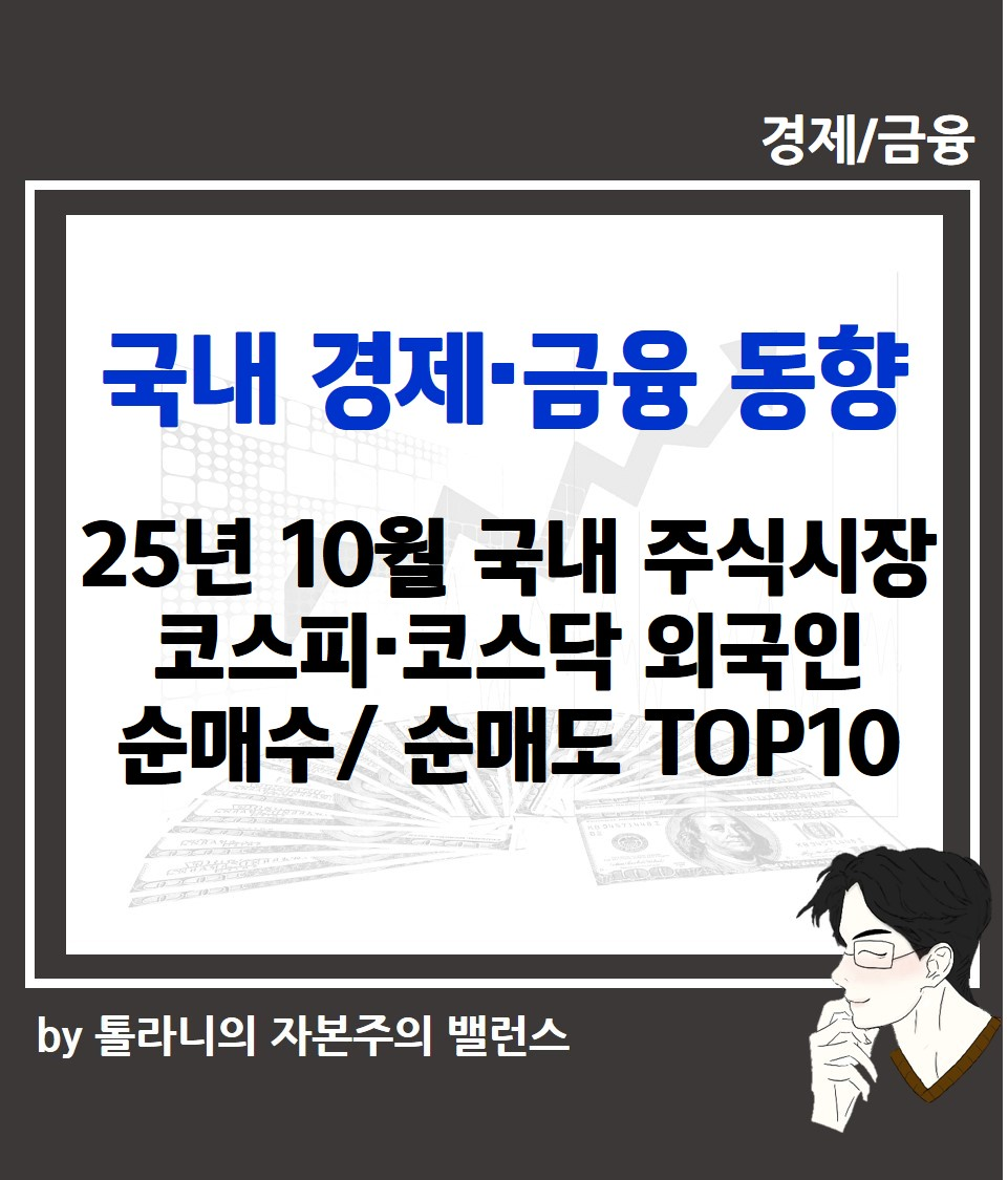 이에 '2025년 10월 국내 주식시장 코스피·코스닥 외국인 순매수 및 순매도 TOP10' 종목을 분석해 보도록 하겠습니다.