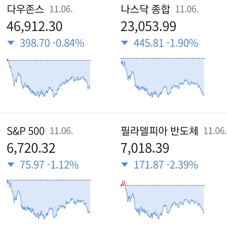 다우지수는 전일대비 -0.84% 하락한 46,912.30에 거래를 마쳤으며, 대형주 중심의 S&P500 지수는 전장대비 -1.12% 떨어진 6,720.32에 장을 마감하였습니다. 기술주 중심의 나스닥 지수는 전 거래일 대비 -1.90% 하락한 23,053.99에 거래를 마치며 장을 마감하였습니다.
