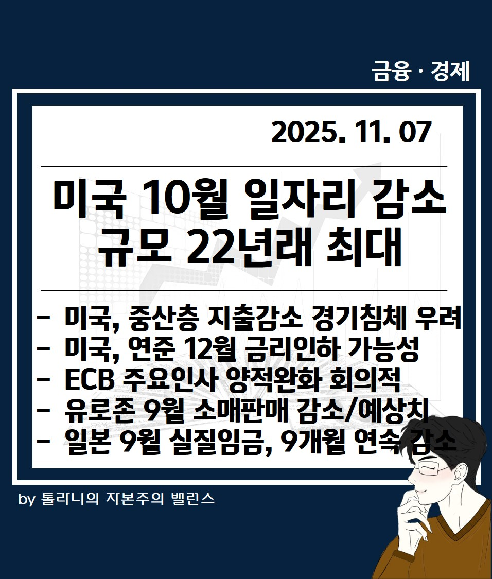 01. 미국, 10월 일자리 감소 규모 22년래 최대. 고용 우려에 금리인하 기대는 증가