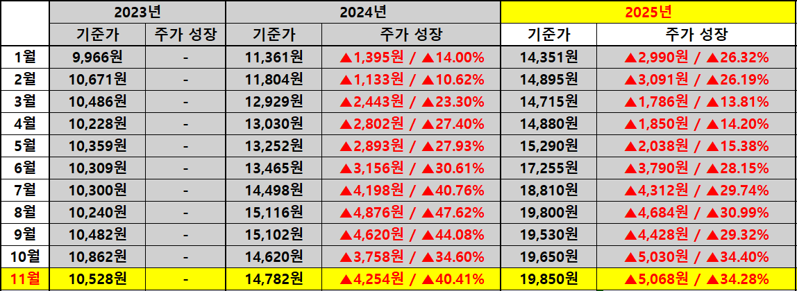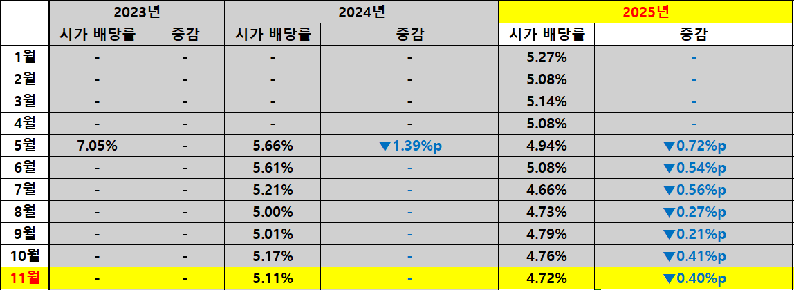 2024년 동기 대비 배당금은 63원에서 78원으로 증가하며 ‘+15원, +23.81%’의 성장을 보였습니다. 단기 배당 변동이 아닌 2023년 이후 지속적인 월별 배당 상향 흐름이 이어지고 있다는 점이 긍정적입니다. 다만 시가배당률은 2024년 5.11%에서 올해 4.72%로 소폭 하락했는데 이는 ‘배당 감소’보다는 ‘주가 상승’이 더 크게 작용한 결과입니다. 실제로 배당락일 기준 주가는 전년 동기 14,782원에서 올해 19,850원으로 상승하며 ‘+5,068원, +34.28%’의 주가 성장률을 보였습니다. 결국 배당금은 늘었지만 주가가 더 빠르게 상승하면서 시가배당률이 상대적으로 낮아진 셈입니다. 즉, ‘배당이 약화된 것처럼 보이지만 실제로는 성장 속도가 주가에 반영된 상태’로 해석할 수 있습니다.