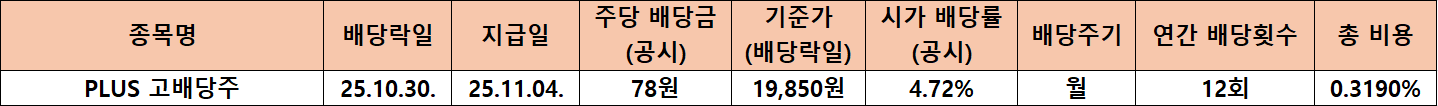 PLUS 고배당주는 2025년 11월 기준 주당 배당금이 78원으로 공시되었고 시가배당률은 4.72%를 기록했습니다. 기준가는 19,850원이며 배당락일은 10월 30일, 지급일은 11월 4일로 확인됩니다. 총보수는 0.3190%로 월배당 ETF 중에서는 비교적 낮은 수준의 비용 구조를 유지하고 있습니다. 배당 주기는 매월 지급되는 ‘월배당’ 형태로 매달 현금 흐름을 확보하기에 적합한 구조입니다.