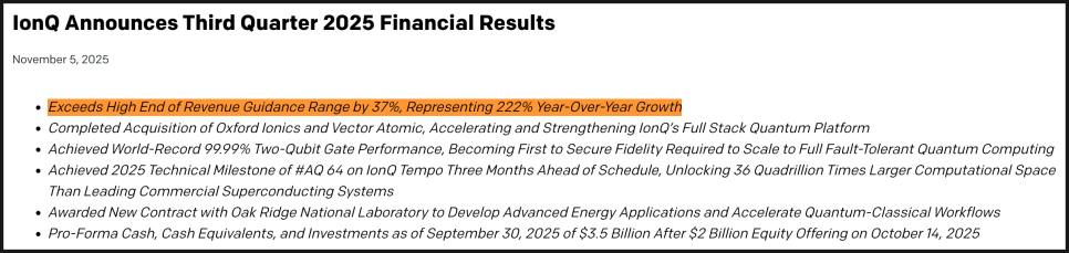 2025년 11월 5일, 아이온큐(IonQ)는 또 한 번 놀라운 분기 실적을 공개했습니다. 매출은 전년 동기 대비 222% 증가한 3,990만 달러, 가이던스 상단을 37% 초과했죠.