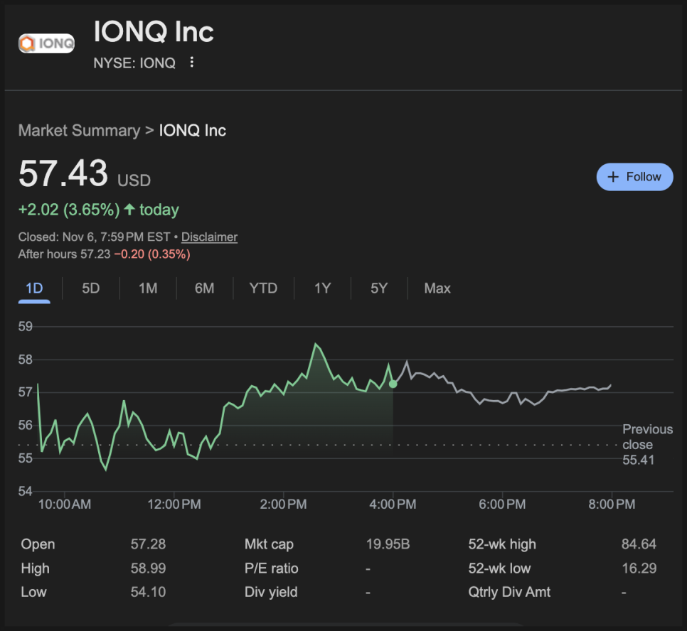 아이온큐(IonQ)의 실적 발표 이후 시장 반응은 꽤 긍정적이었습니다. 전체 기술주가 하락한 날이었음에도 불구하고 아이온큐 주가는 정규장 기준 +3.65% 상승하며 57.43달러로 마감했는데요, 실적 기대치를 크게 웃돈 결과와 투자자들의 기술 자신감이 반영된 흐름으로 볼 수 있습니다.