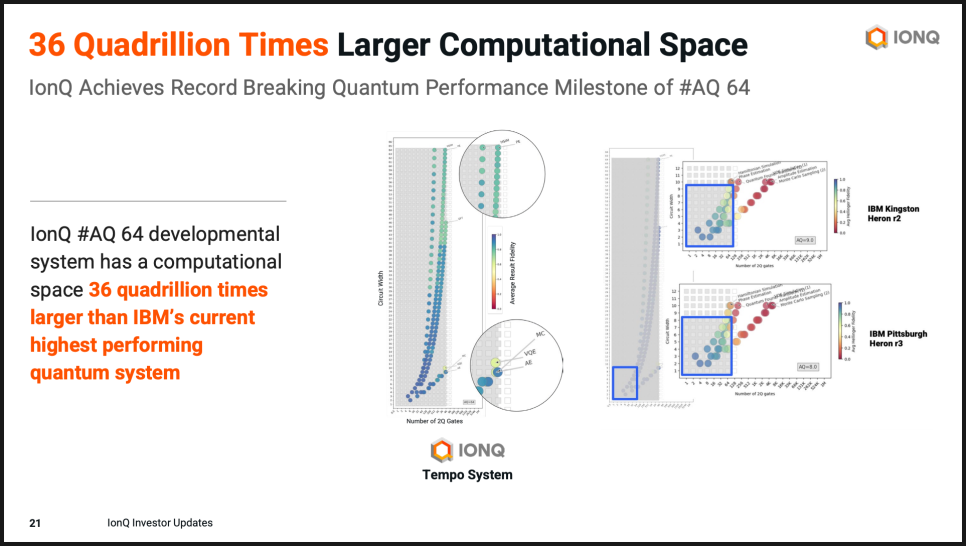 또한 템포(Tempo) 시스템에서 알고리즘 큐비트(AQ) 64를 목표보다 3개월 앞당겨 달성했습니다. 상용 초전도 시스템 대비 36경(10^16)배 이상 넓은 계산 공간을 확보했다는 뜻으로, 현재 양자컴퓨팅 업계에서 가장 높은 수준의 성능을 의미합니다.