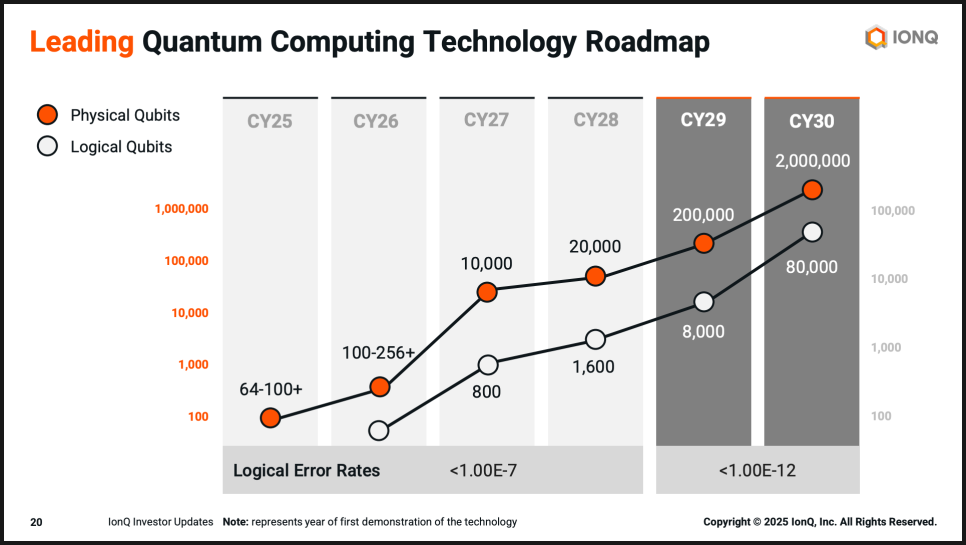 이 성과를 통해 아이온큐는 2030년까지 200만 개의 물리 큐빗(Physical Qubits), 그리고 8만 개의 논리 큐빗(Logical Qubits)을 실현하겠다는 로드맵을 제시했습니다. 현재 상용화된 경쟁사 시스템보다 수십만 배 높은 연산 공간을 확보한 셈이죠.