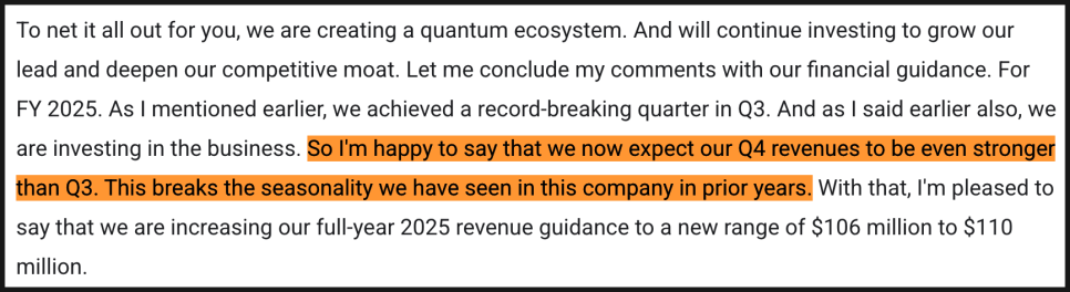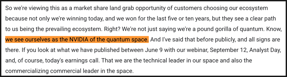 또한 CEO 드 마시는 이번 콜에서 “아이온큐는 양자컴퓨팅의 엔비디아(NVIDIA)가 될 것”이라고 표현했습니다. 즉, 단순한 기술 선도 기업이 아니라 산업 생태계의 중심이 되는 ‘양자 플랫폼’을 구축하겠다는 뜻이죠. 그는 “우리는 이제 컴퓨팅, 센싱, 보안, 네트워킹을 모두 결합해 정부와 다국적 기업의 핵심 인프라를 책임지고 있다”며 “양자 시대는 미래가 아니라 현재”라고 강조했습니다.