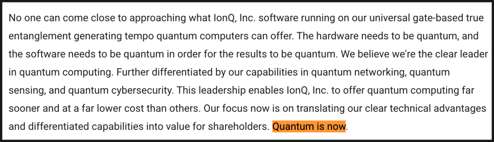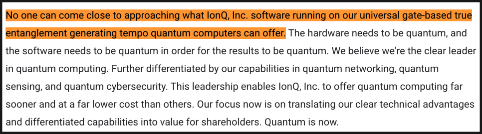 아이온큐는 ‘게이트 기반(gate-based)’ 양자컴퓨팅 방식을 채택하고 있습니다. CEO 드 마시는 이번 콜에서 “많은 기업이 ‘퀀텀(Quantum)’이란 단어를 이름에 붙이지만, 실제로 진짜 양자 얽힘(entanglement)과 계산을 구현하는 기업은 아이온큐뿐”이라고 단언했습니다.