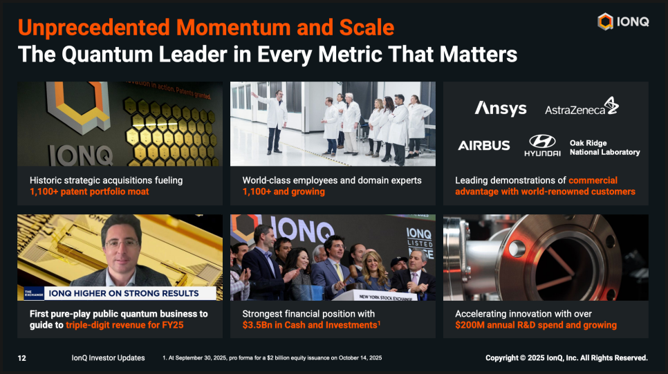 아이온큐는 10월 14일 20억 달러 규모의 주식 발행을 완료하면서, 현금 및 현금성 자산이 35억 달러로 늘어났습니다.