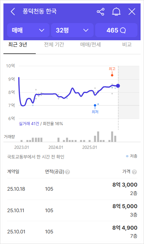 최근 거래된 시세는 8억 5천만원으로 풍선효과를 제대로 받았다. 하지만 이제는 막혀버려 수지구는 토지허가거래구역 및 투기과열지구로 설정되어 매수도 매도도 힘들고 대출규제 6억 한도에다 15억 미만 6억, 15억 초과 20억 미만 4억, 25억 초과 2억까지 규제된다. 여기에 플러스로 재당첨제한, 분양가상한제, LTV 40% 등의 규제가 더해진다. 수지한국아파트의 대지면적은 총 5,545평이며 용도지역은 3종일반주거지역이다.