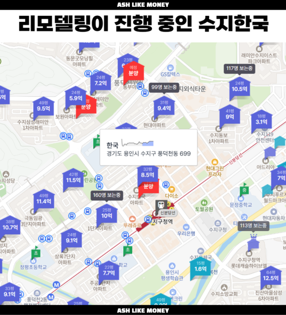 수지한국 아파트는 최근 재건축이 아닌 리모델링으로 사업이 확정되었다. 수지한국은 수지구 신분당선 수지구청역 초역세권으로 입지가 상당하다. 게다가 하수구탄광촌으로 엮일 만큼 잠재성이 강한 곳이지만, 규제지역으로 선정되어 거래하려면 구청의 허가를 받아야 한다. 게다가 투기과열지구로 지정된 만큼 재건축을 할 경우 여러 규제가 달라붙는다. 재건축초과이익환수제가 대표적인데, 그래도 재당첨제한, 실거주의무 등의 까다로운 제약은 어쩔 수 없다.
