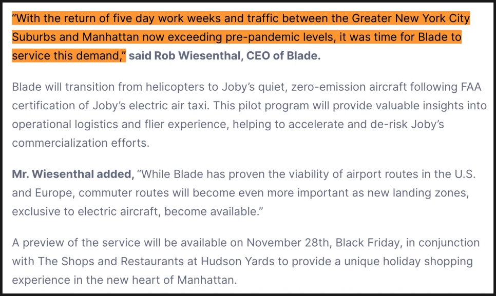 블레이드의 CEO 롭 와이젠털(Rob Wiesenthal) 은 “팬데믹 이후 다시 활발해진 출퇴근 수요를 반영한 서비스”라며, “조비 항공기의 상용화 이전에 운항 데이터를 축적하고 고객 경험을 검증하는 실질적 테스트베드가 될 것”이라고 밝혔습니다.