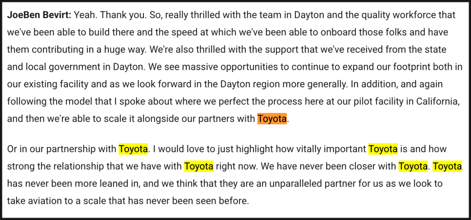 생산 측면에서 조비는 토요타와의 협력 강화를 재차 강조했는데요. 조벤 비버트는 “토요타와의 관계가 그 어느 때보다 공고하다”며, “항공산업 역사상 전례 없는 규모의 양산 체계를 구축 중”이라고 설명했습니다.