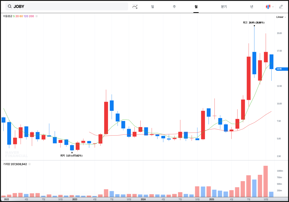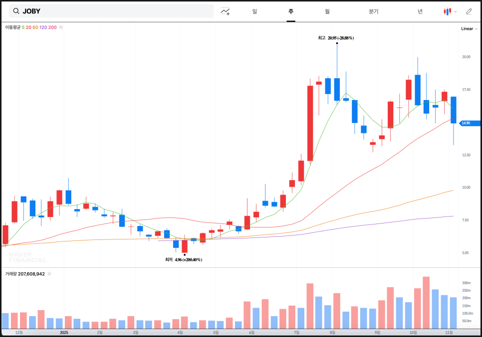 월봉 차트로 보면, 조비의 주가 구조는 여전히 상승 초기 국면에 있습니다. 2023년 중반까지만 해도 3달러대에서 거래되던 종목이 2025년 들어 6배 이상 상승한 셈이죠. 거래량 역시 올해 들어 급격히 증가해, 장기 투자자들의 신규 진입이 본격화된 패턴으로 볼 수 있습니다. 다만 20달러대 초반에서 두 차례 장대 음봉이 출현한 점을 감안하면, 중기적으로는 12~13달러대의 조정 후 재도약이 이상적 흐름입니다.