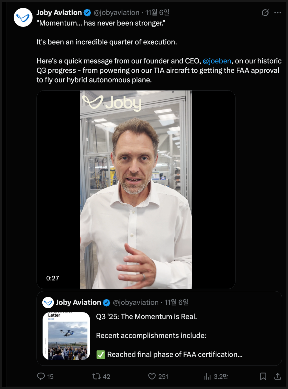 여전히 막대한 현금을 가용하고 있지만, CEO 조벤 비버트는 실적 발표 발언에는 자신감에 차있었습니다: “우리는 지금 항공 역사상 한 번도 없었던 속도로 기술과 규제가 함께 움직이고 있다"며 "자율비행, 수소연료, 하이브리드 기체 등 세 가지 축이 동시에 진화하는 시기"인데 "조비의 수직 통합 구조는 이런 혁신을 현실로 만드는 우리의 ‘슈퍼파워’"라고 설명을 했죠.