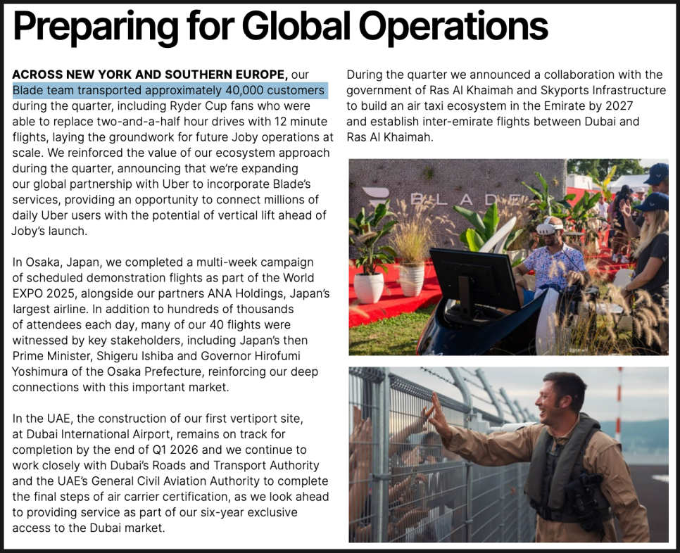 한편 블레이드는 지난 3분기 동안 약 4만 명의 승객을 수송했습니다. 특히 라이더컵(Ryder Cup) 행사 기간 동안 2시간 반이 걸리던 자동차 이동을 단 12분으로 단축하는 항공 서비스를 제공했다고 하는데요. CFO 로드리고 브루마나(Rodrigo Brumana) 는 이번 분기에 발생한 매출 2,300만 달러 중 블레이드 인수 이후(8월 29일~9월 30일) 에서만 1,400만 달러가 발생했다고 밝혔습니다.