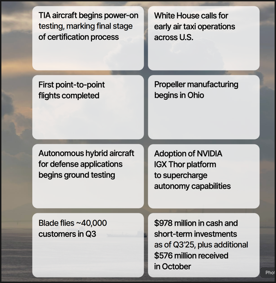 이와 함께 오하이오 공장의 양산 확대, 블레이드와 우버 서비스 통합, 자율비행 기술 슈퍼파일럿(Superpilot)의 국방 실험 성공 등등 굵직한 소식이 많았는데요. 실적 발표 중 주요 내용과 함께 마지막에는 최근 주가 흐름 및 차트 분석까지 해보겠습니다.