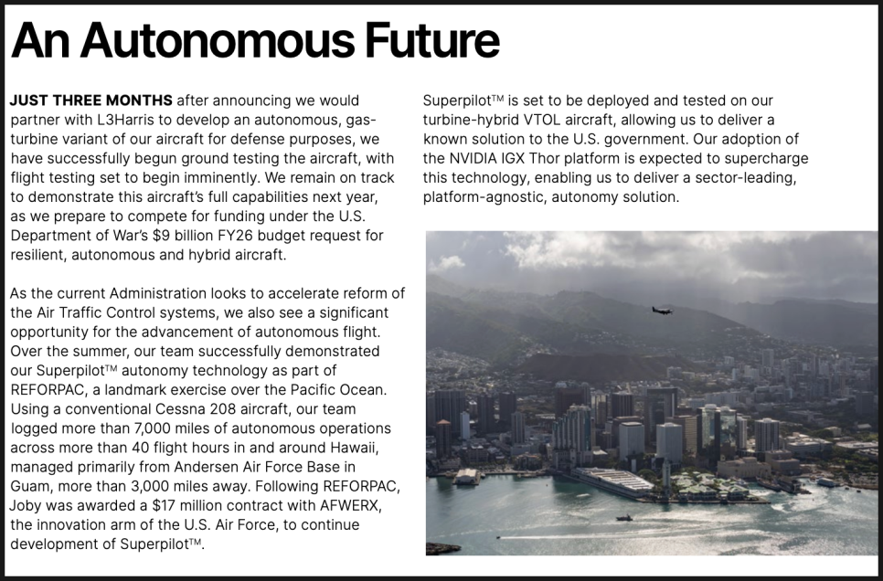 또한 조비는 엔비디아(NVIDIA)의 IGX Thor 플랫폼을 채택해 자율비행 소프트웨어 성능을 대폭 강화할 계획이라고 밝혔습니다.