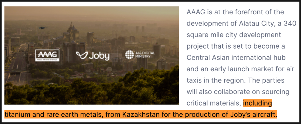 흥미로운 점은 이번 계약이 항공기 제조에 필요한 핵심 소재 확보 협력까지 포함하고 있다는 것인데요. 조비는 카자흐스탄산 티타늄과 희토류 금속(rare earth metals) 을 항공기 생산에 활용하는 방안을 모색 중이며, 이는 장기적으로 미국 외 지역에서의 공급망 안정화와 원가 절감에 크게 기여할 전망입니다.