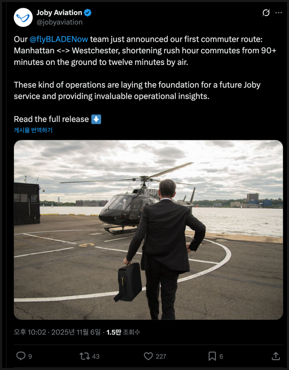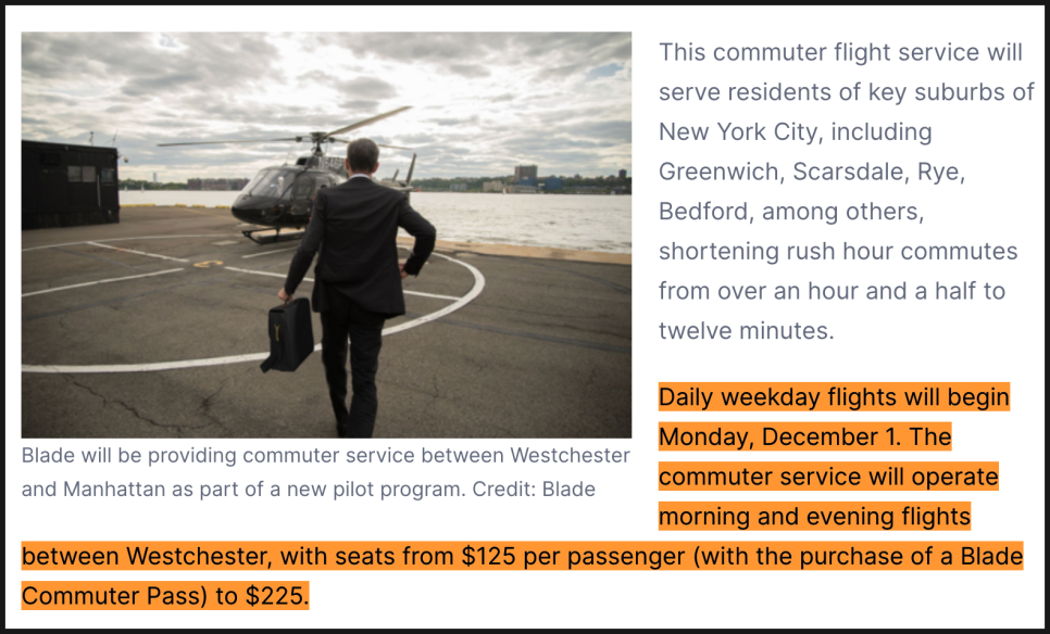 자회사 블레이드 어반 에어 모빌리티는 2025년 12월 1일부터 맨해튼과 웨체스터 카운티 공항을 오가는 평일 정기 통근 노선을 운영할 예정입니다.