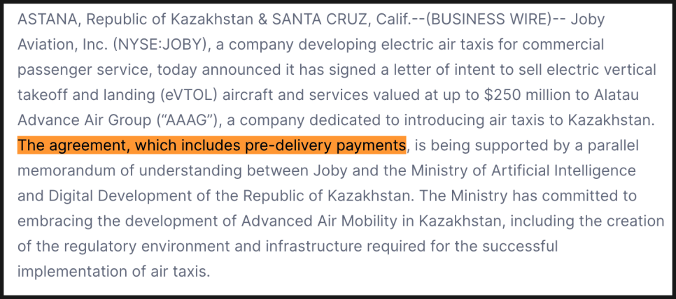 그리고 이번 계약에는 선납금(pre-delivery payments) 조항이 포함되어 있어, 실제 납품 이전에도 조비의 현금 유동성 확보에 도움이 될 수 있어 보입니다.