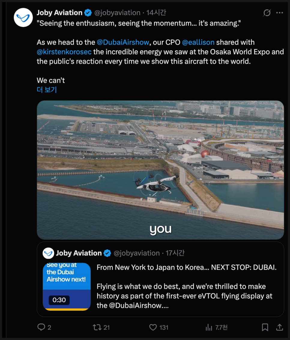 조비는 FAA 인증의 마지막 단계인 전원 가동(Power-On) 테스트를 개시했고, 세계박람회(Expo 2025 Osaka) 에서 수십만 명이 지켜보는 가운데 실제 비행을 성공적으로 시연했습니다. 또한 미국 백악관의 eVTOL 통합 시범사업(eIPP) 참여를 공식화하며 정책적 지원의 흐름 속에 올라탔죠.