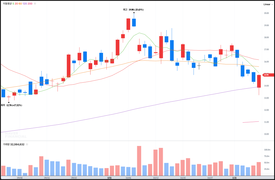 일봉 기준으로는 10월 초까지 이어진 단기 상승세가 19.8달러에서 정점을 찍은 뒤, 점차 하락 전환된 모습입니다. 현재가는 약 14.9달러 수준으로, 60일선이 무너졌고 120일선 근처에서 지지를 시도하고 있습니다. 최근 거래량이 다시 늘어나며 매도 압력이 강해진 점을 보면, 단기적으로는 14달러 지지 여부가 핵심 구간으로 보입니다. 이 구간이 이탈되면 13달러 초반까지 열려 있고, 반대로 반등 시에는 16달러 부근이 첫 저항선으로 작용할 가능성이 큽니다.