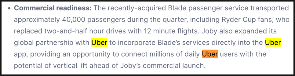 또한 조비는 이번 분기에 우버(Uber) 와의 글로벌 파트너십을 확장해, 블레이드 서비스를 우버 앱에 통합하기로 했습니다. 향후 조비의 eVTOL 항공기가 상업 운항을 시작할 때, 수백만 명의 우버 사용자를 즉시 고객으로 전환시킬 수 있는 강력한 유통 채널이 될 것으로 보입니다.